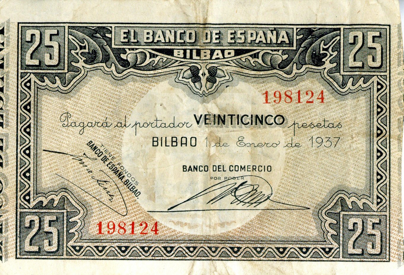 | Resumen: | Billete por valor de veinticinco pesetas emitido en Bilbao, a 1 de enero de 1937, librado por el Banco de Comercio, con la autorización del Banco de España en Bilbao por orden del Gobierno de Euzkadi.
