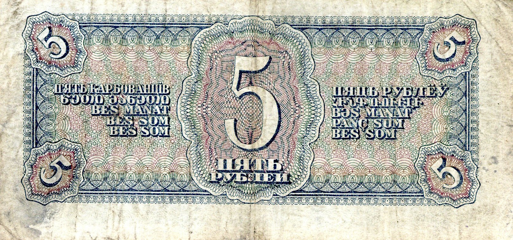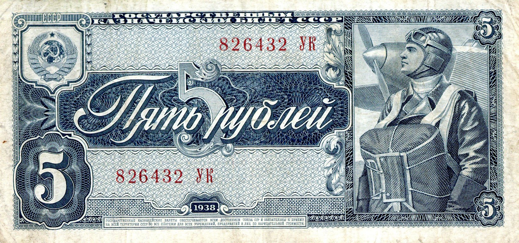 Resumen: Billete de 5 (cinco) rublos emitido en 1938 en la Unión Soviética. Nº serie: 826432 УК. En un ambiente prebélico en Europa, en el anverso figura un aviador militar.