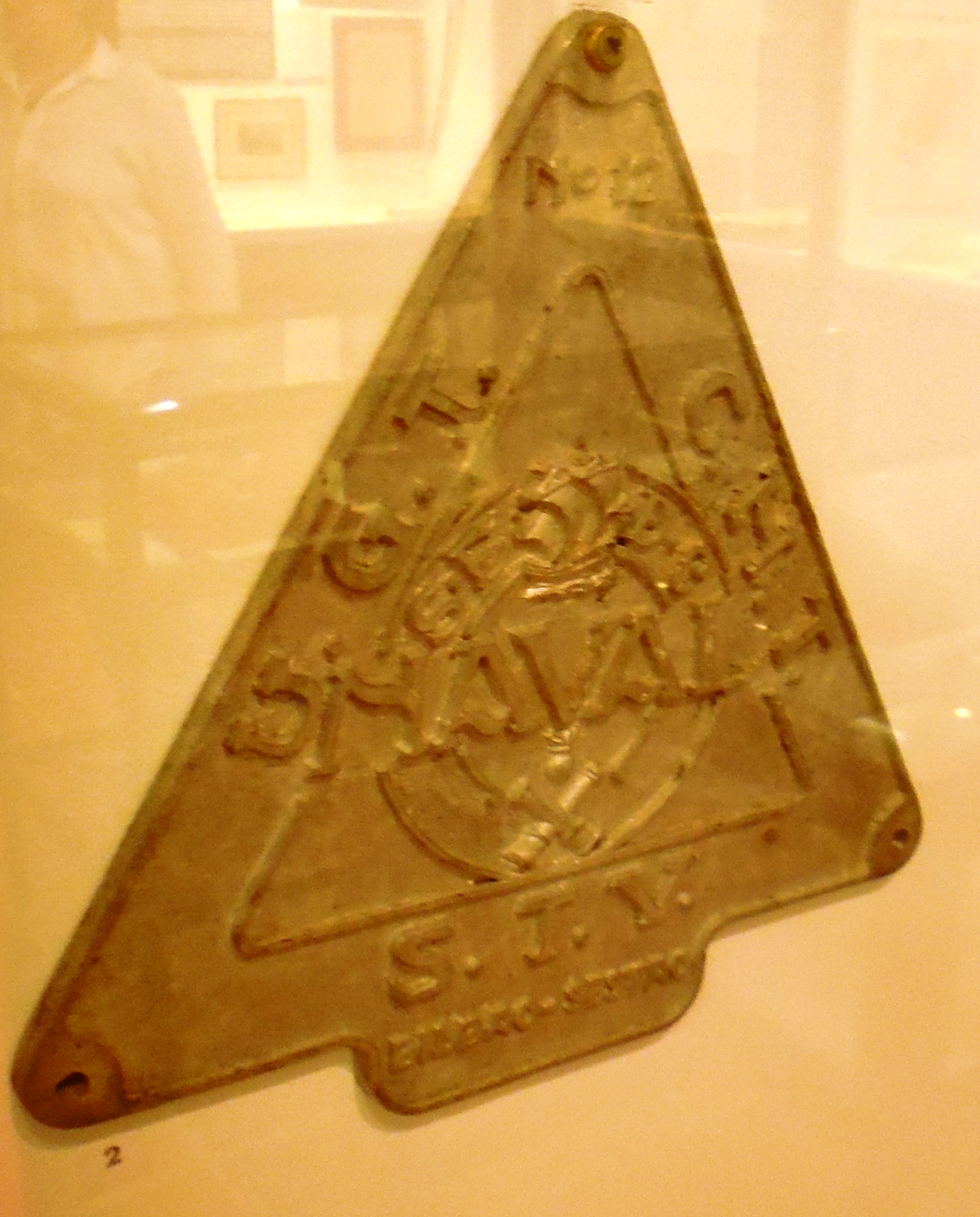 Deskribapena: Placa metálica de los sindicatos de la Naval de Sestao (Bizkaia) : CNT, UGT y STV. Se expone en una de las vitrinas del Museo de la Sociedad de Amigos de Laguardia.