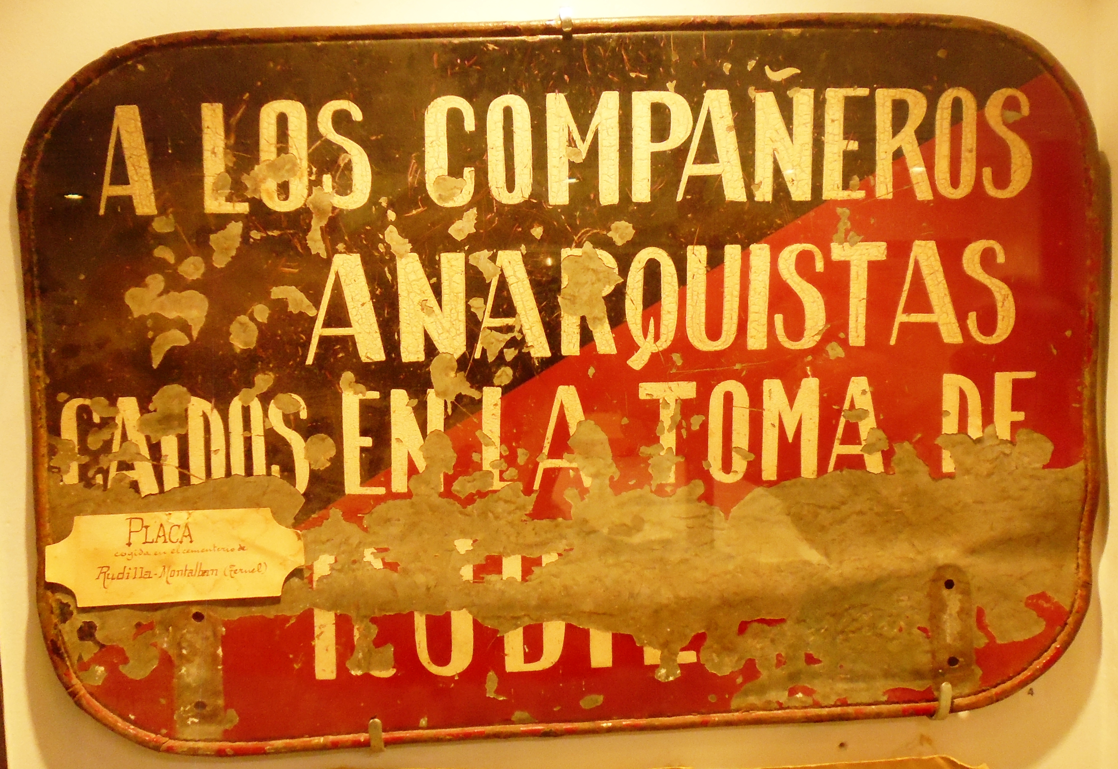 Resumen: Placa conmemorativa anarquista a los caídos en la toma de Rudilla (Teruel) que se expone en el Museo de la Sociedad de Amigos de Laguardia.