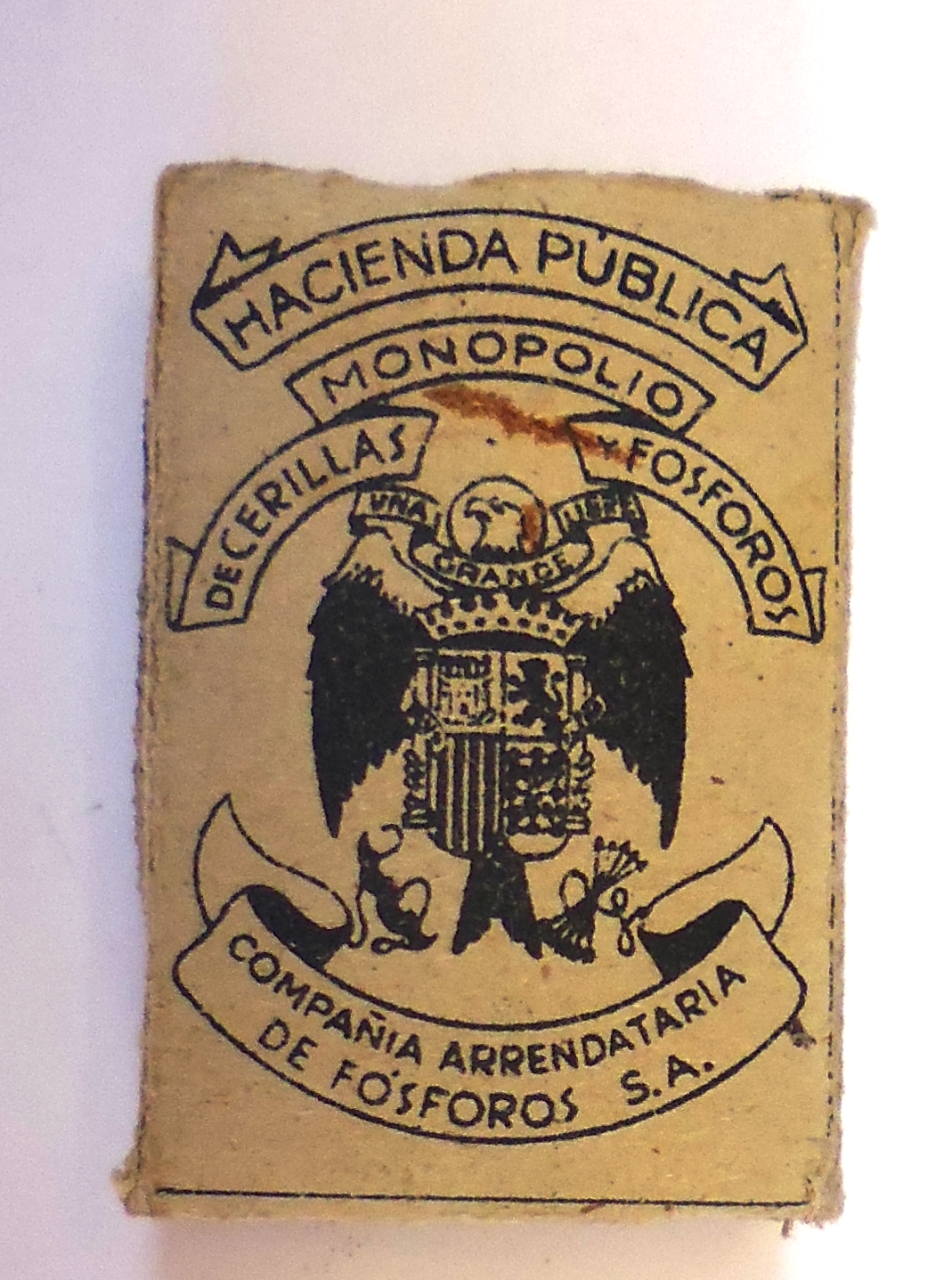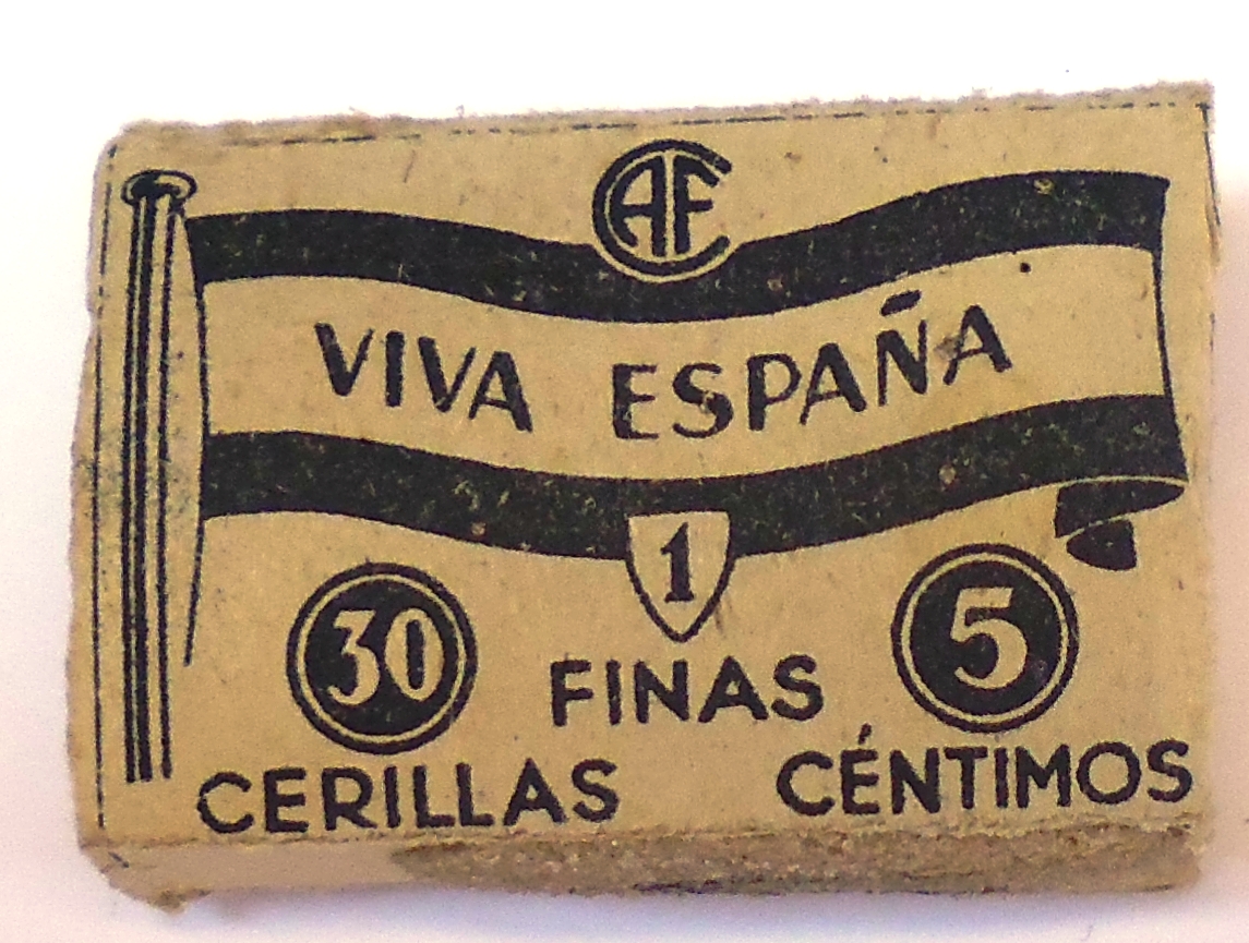 Deskribapena: Cajetilla de cerillas de la posguerra civil española con el lema "Viva España". En cartón y papel abrasivo pegado sobre la caja.