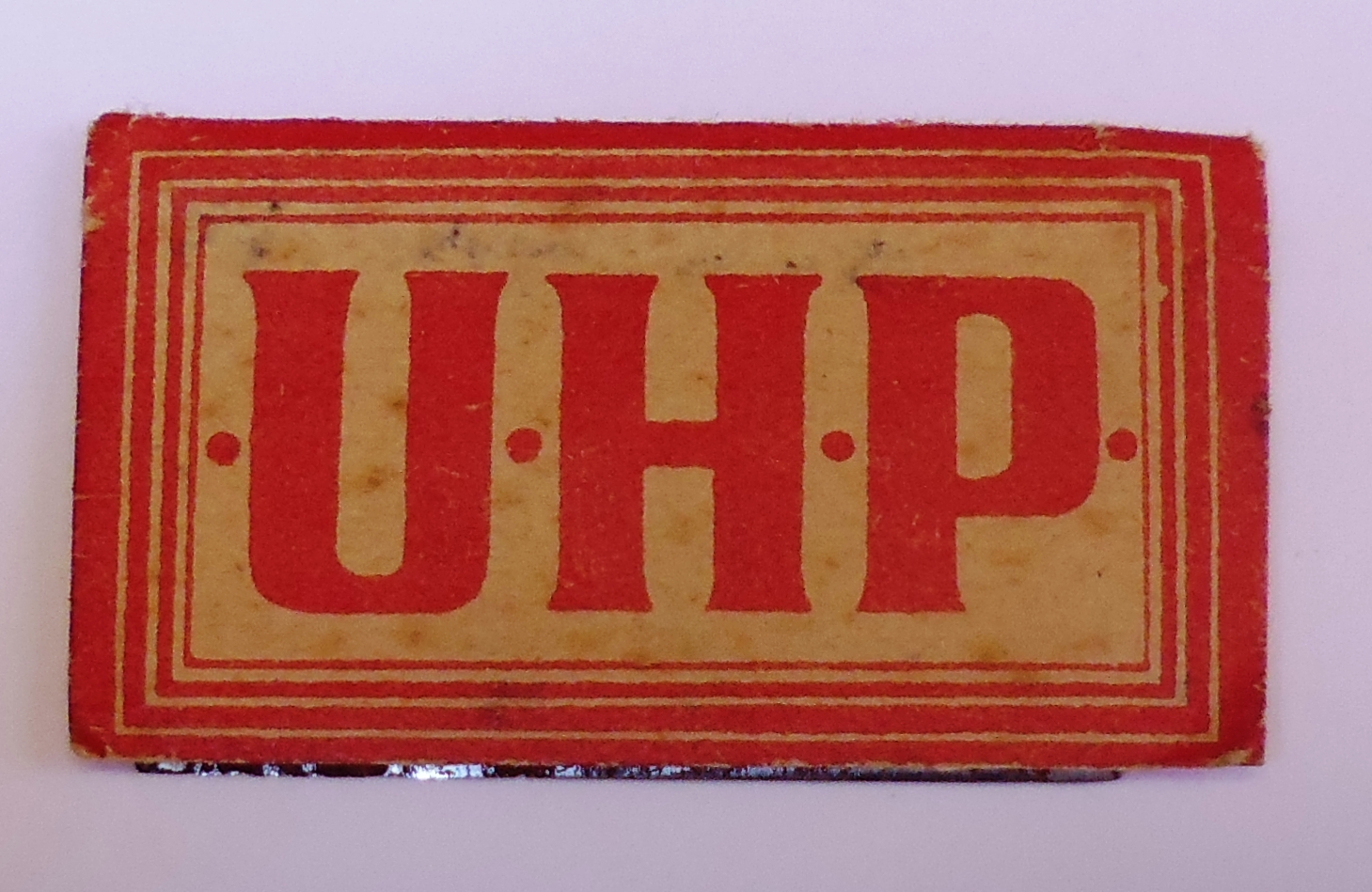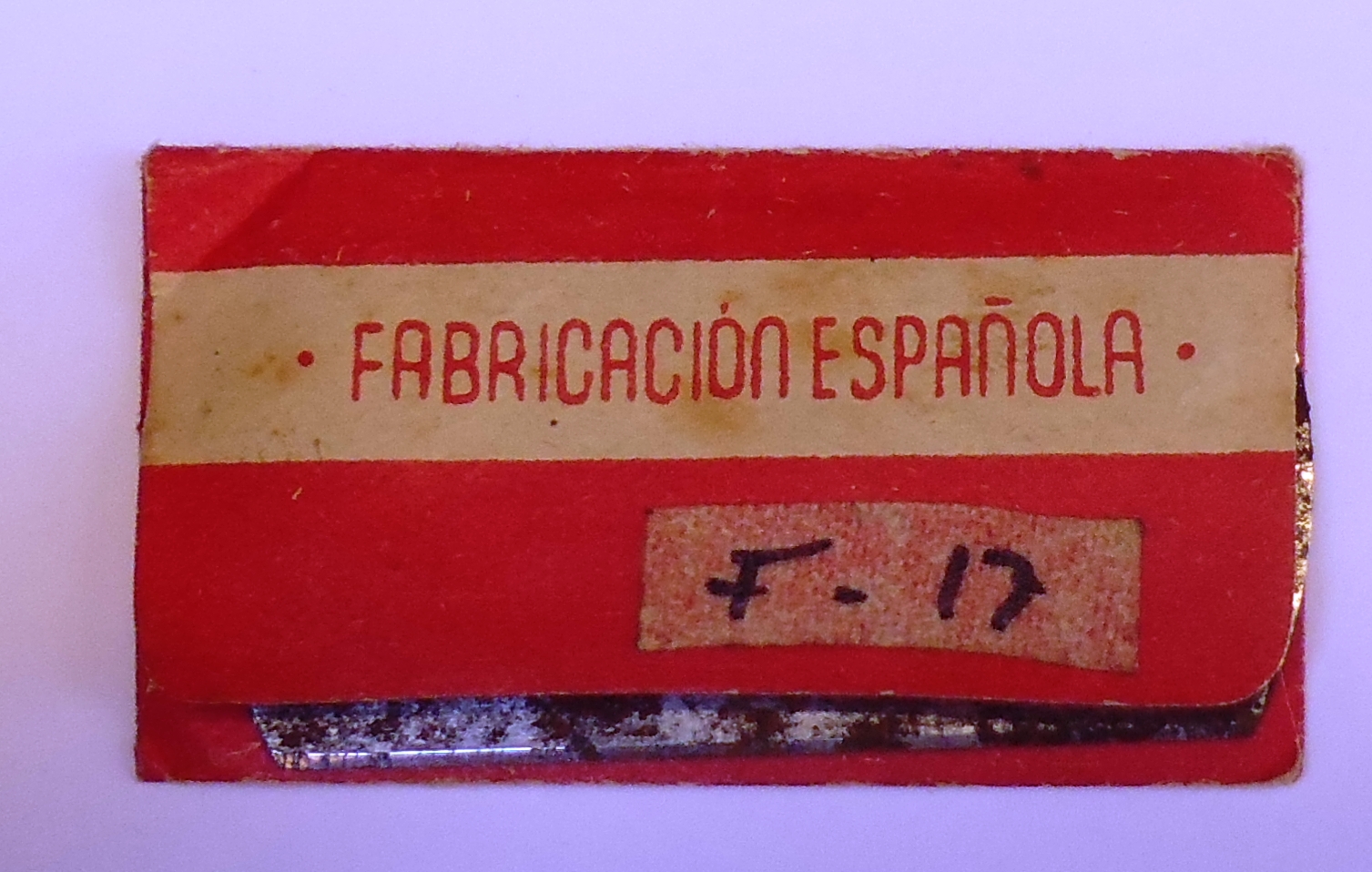 Deskribapena: Hoja de afeitar con funda rectangular de color rojo con las siglas "U.H.P." (Uníos Hermanos Proletarios), proclama habitual del bando republicano y el texto "Fabricada española".