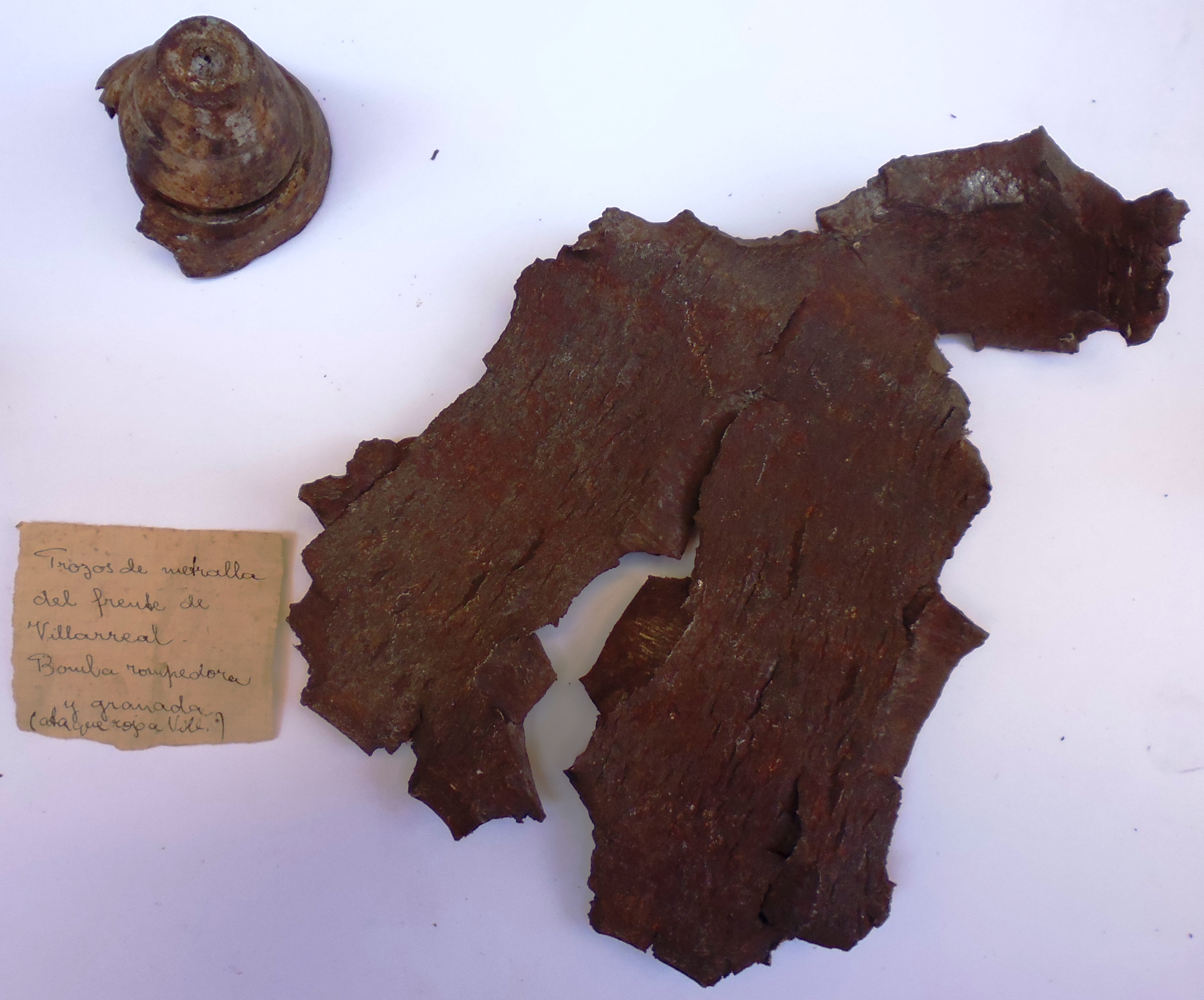 Description: Espoleta de artillería y fragmento de proyectil disparados contra la localidad de Villarreal de Álava por las fuerzas republicanas durante la ofensiva contra Vitoria. Diciembre 1936.