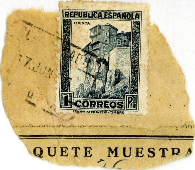 Resumen: Sello de la República Española con imagen de las casas colgantes de Cuenca. 1 peseta. Matasellado y recortado de sobre.