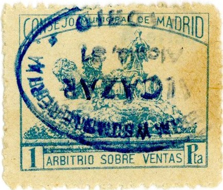 Resumen: Sello del Consejo Municipal de Madrid. Arbitrio sobre ventas. 1 peseta. Serie A 136275 13. Matasellado.
