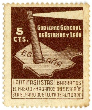 | Izenburua: | Sello de 5 cts. : Gobierno General de Asturias y León : ¡antifascistas! barramos el fascio y hagamos que España sea el faro que ilumine el mundo |