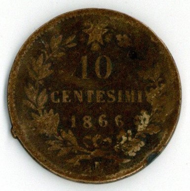 | Resumen: | 10 Centésimi del reinado de Víctor Manuel II de Saboya. Anverso: Vittorio Emanuele IIº re d'Italia. Reverso: 10 centesimi - 1866. Ceca de Nápoles. Aleación: cobre. Canto: liso. Forma: redonda. |
