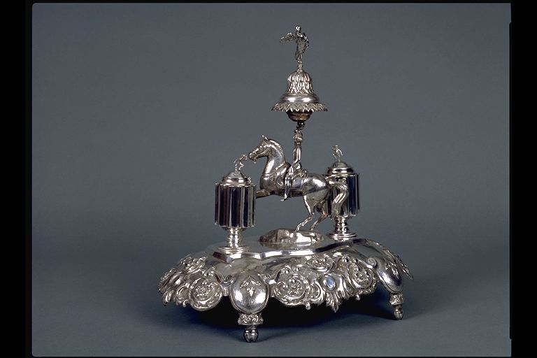 | Resumen: | Técnica: Plata repujada y cincelada. Peso: 1.280 gramos. Fecha de ejecución: último tercio del S. XIX Dimensiones: 38 X 36 X 24 cm. Figura a caballo sujetando la campanilla con la cabeza. Los tinteros de gallones cóncavos son al estilo de los utilizados en trabajos de la Real Fábrica de Platería. Es un trabajo ligero de peso. Inscripciones: