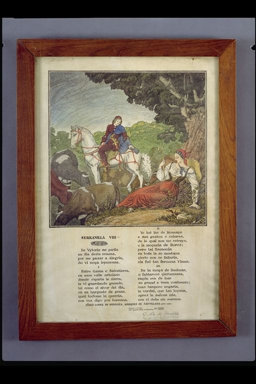 | Resumen: | Técnica: Dibujo buril Soporte-Materia: Papel Dimensiones: 62 X 43 cm. ; con marco: 70,5 X 51 cm. Acompaña al dibujo en la parte inferior el poema "Serranilla VIII de Iñigo López de Mendoza, marqués de Santillana (1398-1458). Edición limitada de 100 ejemplares numerados. Inscripción: firmado en ángulo inferior derecho. No está numerada. Expurgado Nota: la pieza ya no pertenece al Patrimonio de la Fundación Vital. |