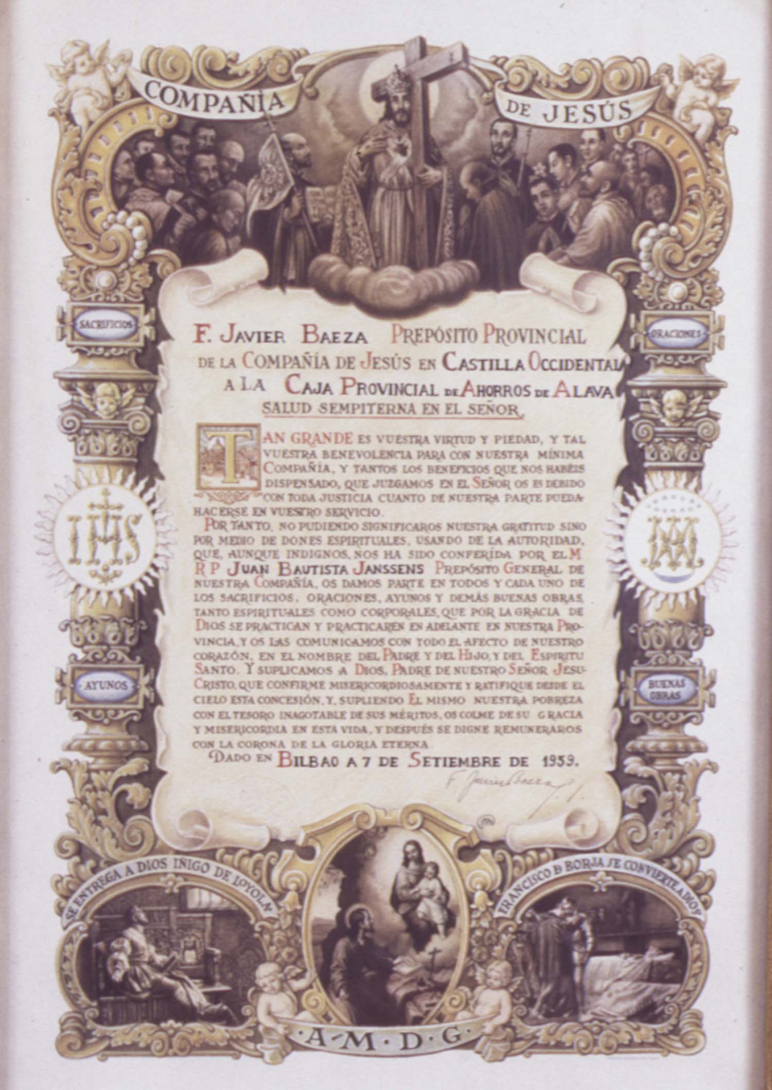 | Resumen: | Técnica: Litografía. Soporte-Materia: Papel Dimensiones: 35 X 25 cm. ; con marco: 53 X 41 cm. Fechado: Bilbao, 7 de septiembre de 1959 Orla de la Compañía de Jesús. Expurgado Nota: la pieza ya no pertenece al Patrimonio de la Fundación Vital. |