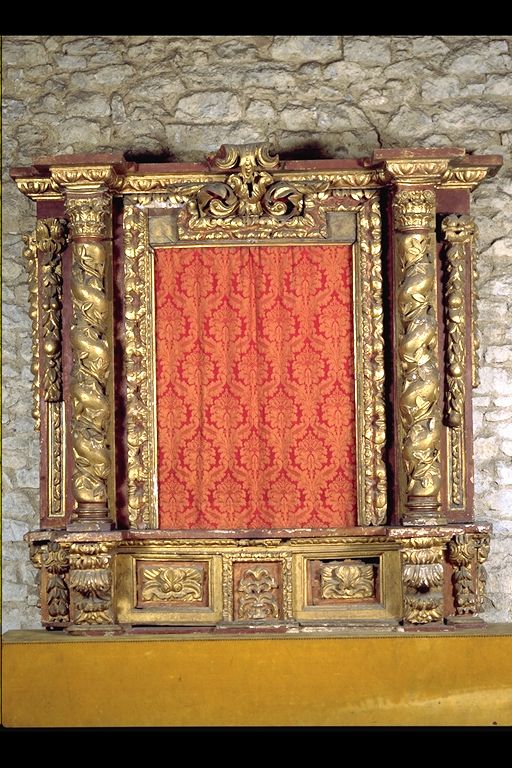 | Description: | Técnica: Policromado Soporte-Materia: Madera policromada en oro y brocado rojo. Dimensiones: 240 X 280 X 50 cm. Fecha de ejecución: s. XVII-XVIII Altar dorado con dos columnas en en frente. En la parte superior, el cuadro central va entre dos columnas salomónicas y, en la parte baja, predelas también con talla. Expurgado Nota: la pieza ya no pertenece al Patrimonio de la Fundación Vital. |