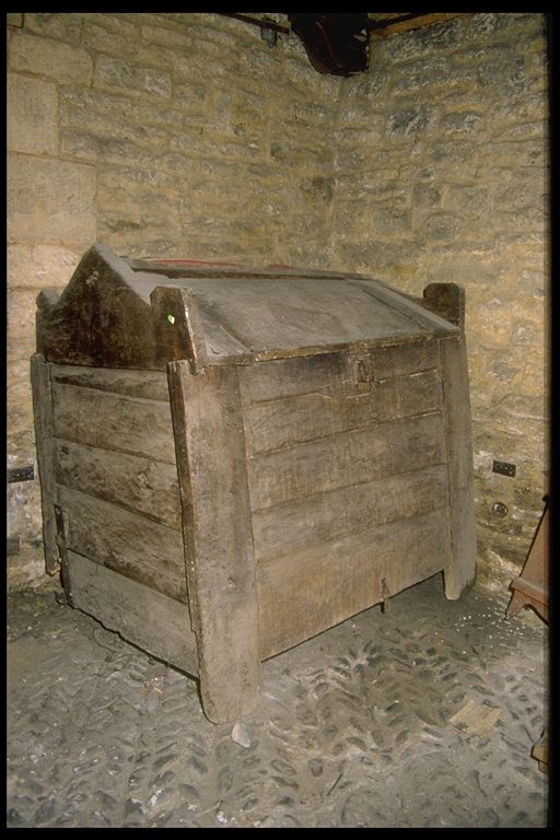 Antigua arca para grano con parte superior en forma de tejado a dos aguas. Servía para los diezmos y primicias entregadas anualmente a la Iglesia.