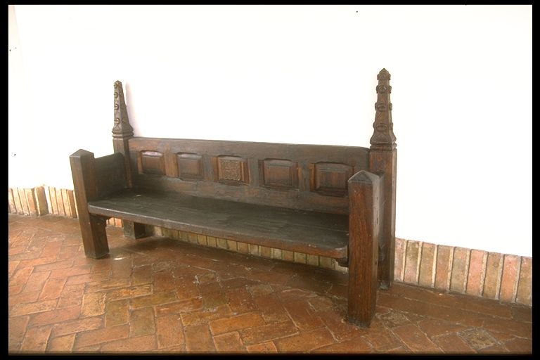 Banco antiguo con remates góticos y cuarterones en el respaldo. Tiene escudo en el centro.
