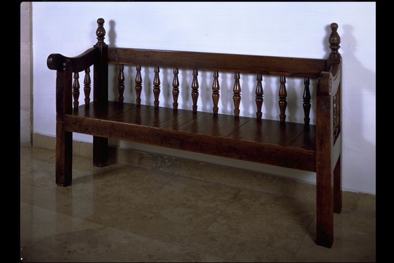 Trece bancos corridos con remates en los extremos y bolillos torneados en el respaldo. Estilo rústico.