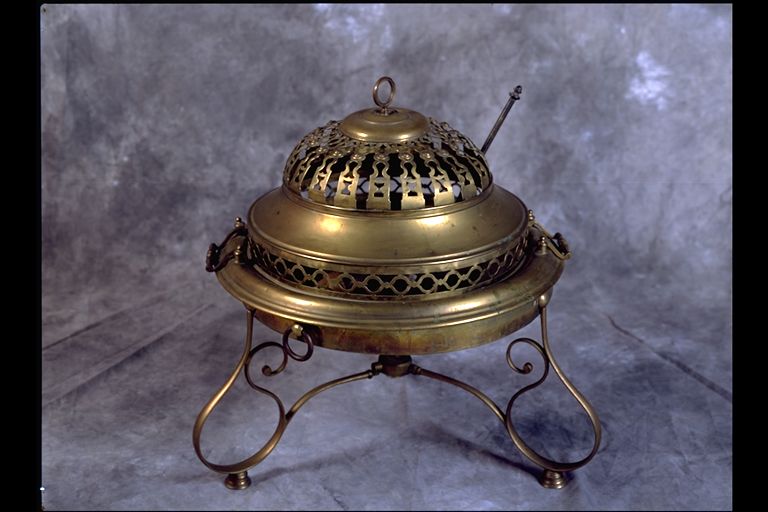 Brasero de latón formado con cuatro piezas, patas y tapa perforada