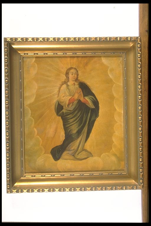 Imagen de la Virgen radiante y rodeada de nubes blancas.