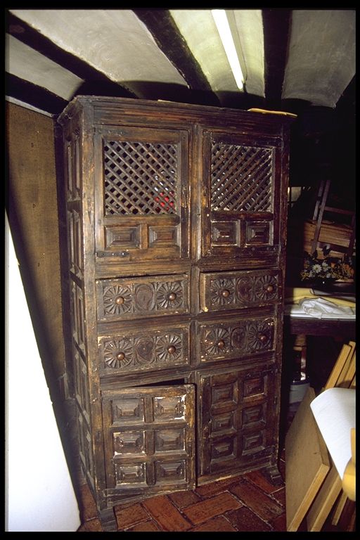 Armario con cuatro puertas y celosía. Tiene cuatro cajones tallados.