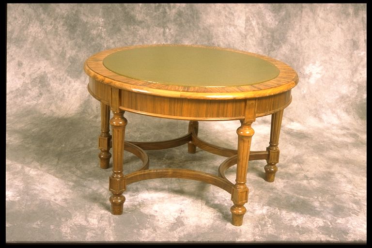Mesa circular de cinco patas torneadas y tapete de piel verde. Estilo Luis XV-XVI