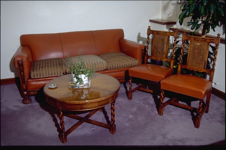 | Deskribapena: | Técnica: Ebanistería Materia-soporte: Madera y piel Dimensiones: mesa Ø 78 X 50 cm. ; tresillo 90 X 83 X 185 cm. ; silla 46 X 50 X 97 cm. Tresillo de tres plazas de piel y madera tallada. Una mesa redonda baja de marquetería y patas torneadas. Dos sillas con respaldo de paja tejida y asiento tapizado. Expurgado Nota: la pieza ya no pertenece al Patrimonio de la Fundación Vital. |