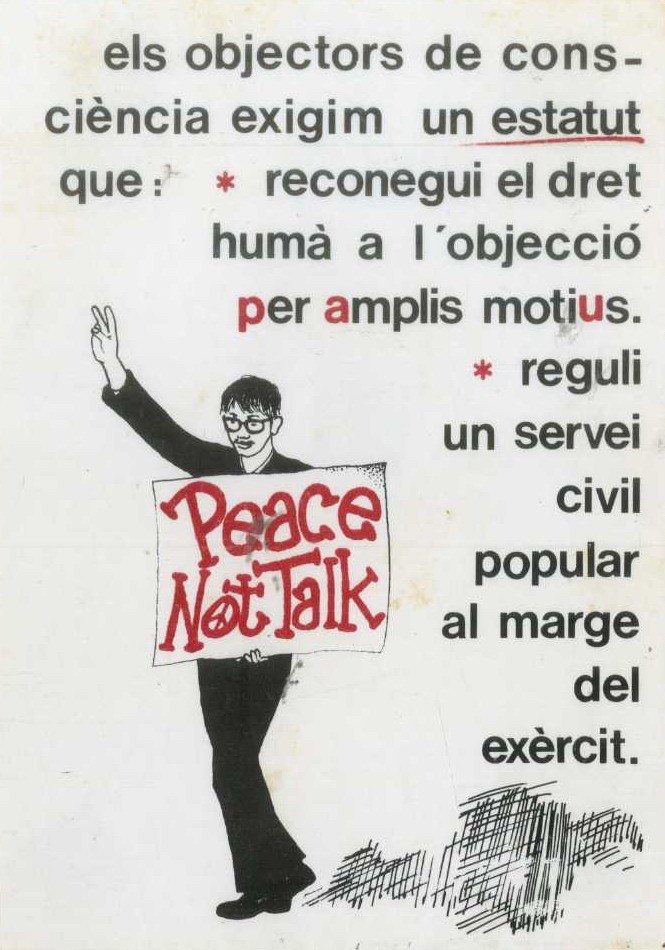 Título: Els objectors de consciència exigim un estatut que : reconegui el dret humá a l´objecció per amplis motius : reguli un servei civil popular al marge del exèrcit : peace not talk