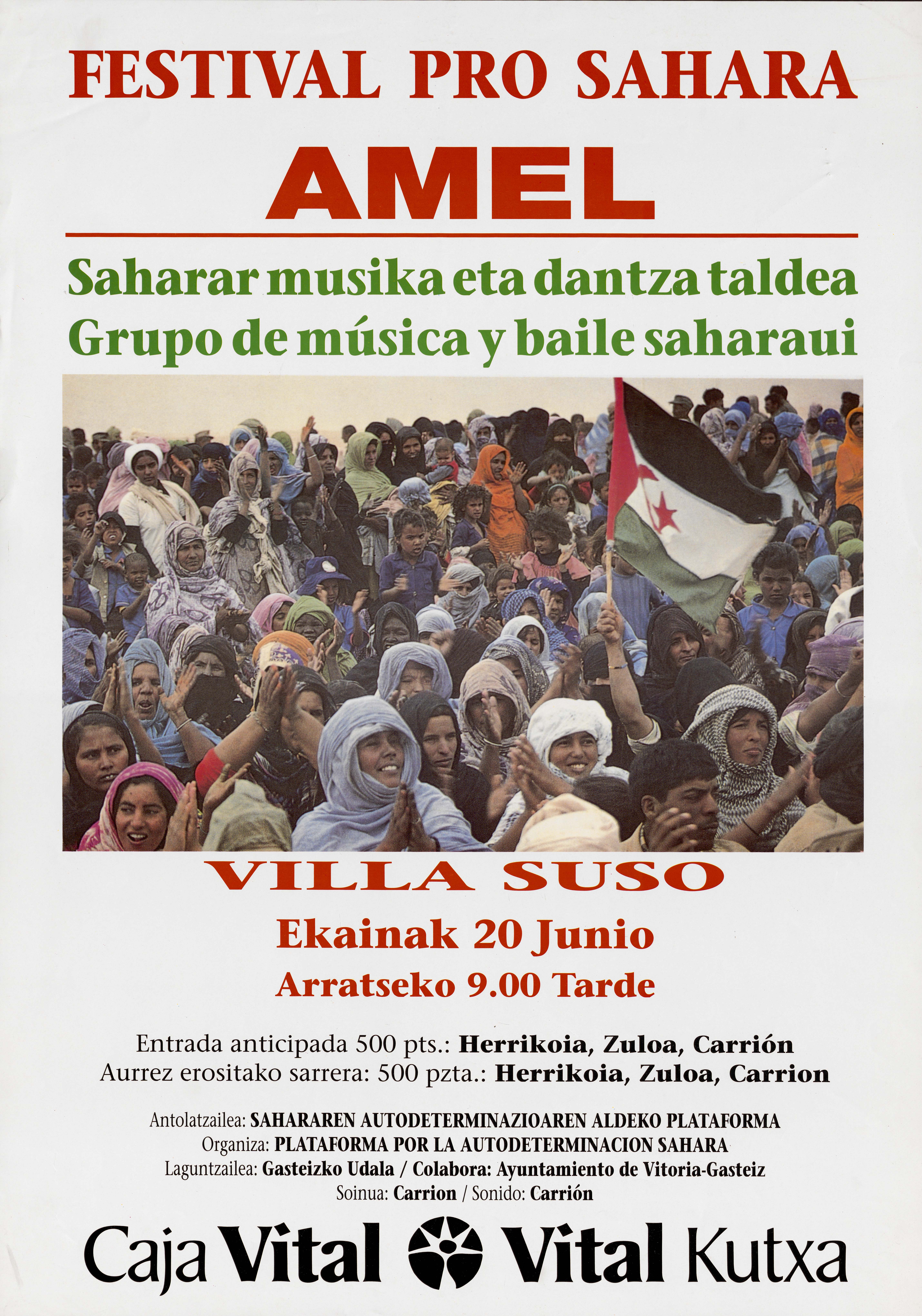 | Título: | Festival pro Sahara Amel [Material gráfico] : Saharar musika eta dantza taldea : Villa Suso ekainak 20 junio : antolatzailea Sahararen Autodeterminazioaren Aldeko Plataforma = grupo de música y baile saharaui : organiza, Plataforma por la Autodeterminación Sahara : entrada anticipada 500 pts. : Herrikoia, Zuloa, Carrión. |