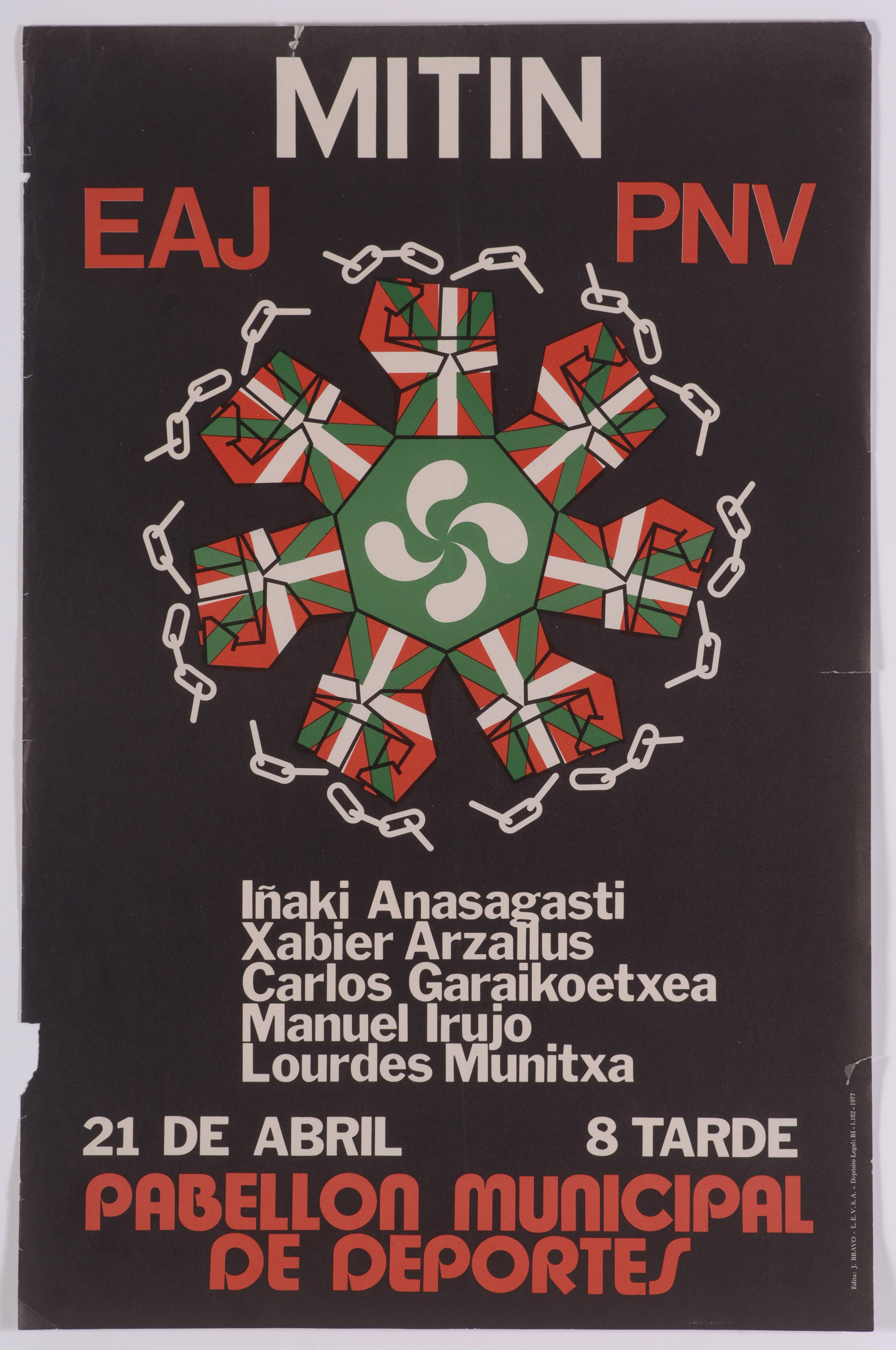 Título: Mitin EAJ-PNV [Material gráfico] : Iñaki Anasagasti, Xabier Arzallus, Carlos Garaikoetxea, Manuel Irujo, Lourdes Munitxa : 21 de abril 8 tarde pabellón municipal de deportes.