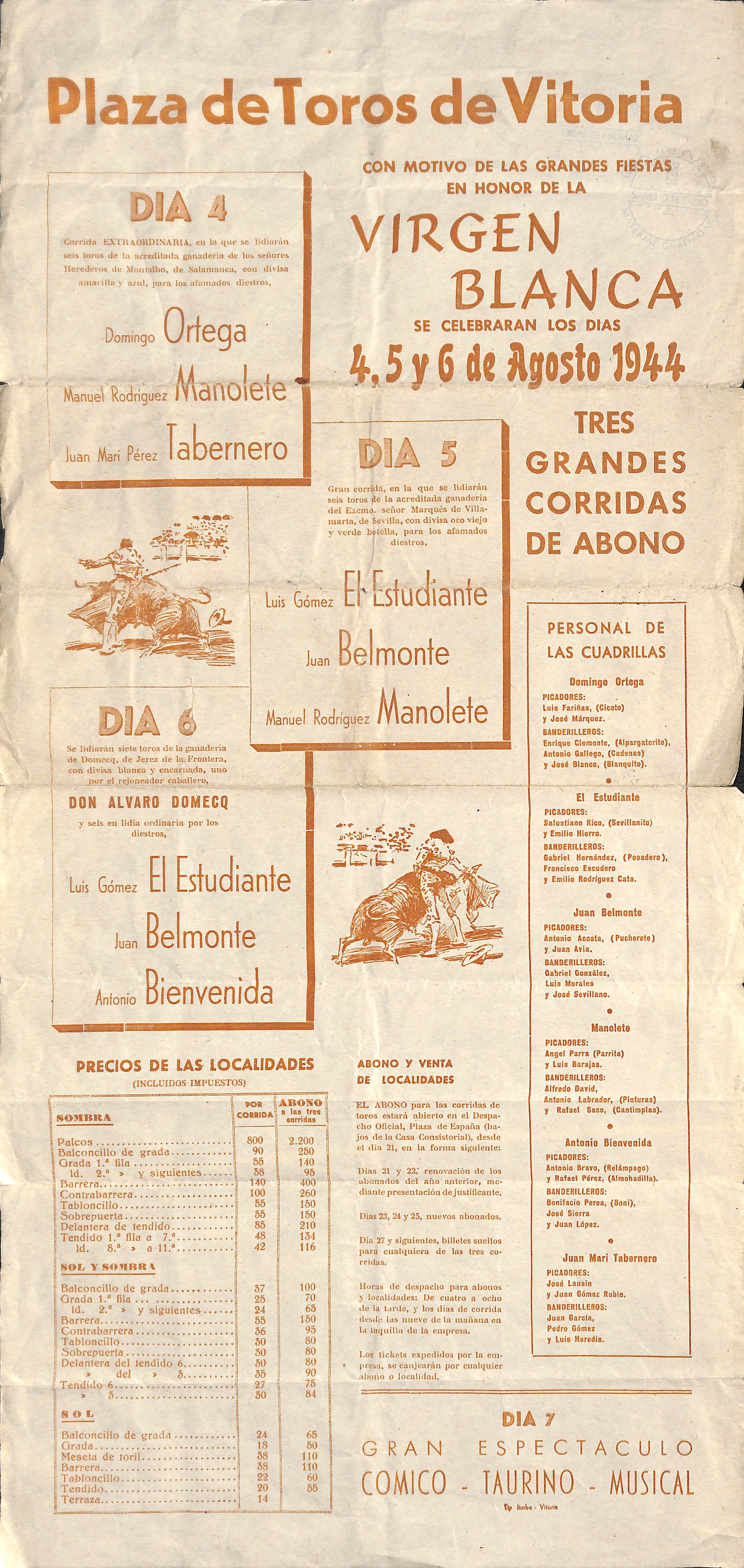 | Título: | Plaza de toros de Vitoria [Material gráfico] : con motivo de las grandes fiestas en honor de la Virgen Blanca se celebrarán los días 4,5 y 6 de agosto 1944 tres grandes corridas de abono... |