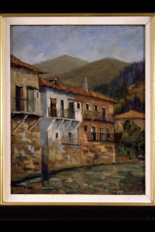 Paisaje rural con el río junto a la pared de las casas y montes al fondo.