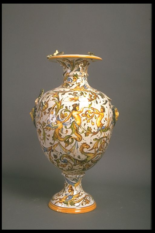 Jarrón de cerámica, de fondo blanco, asas en forma de serpiente y decoración fantástica. Estilo francés.