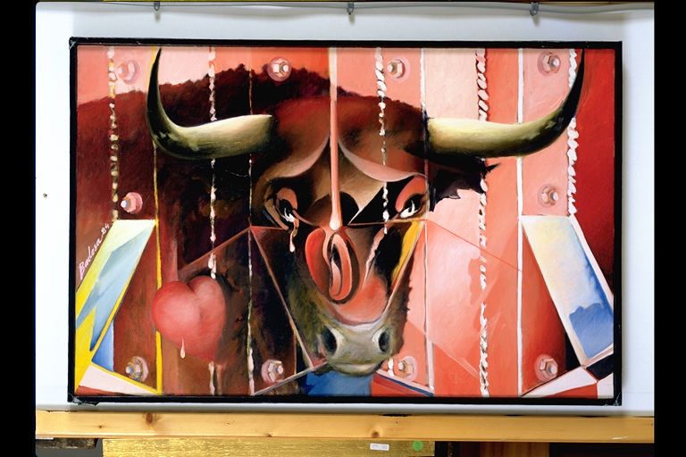 | Resumen: | Exposición Técnica: Óleo Materia-soporte: Tela Fecha de ejecución: 1984 Toro visto de frente reflejado en una pared de piezas metálicas. Firmado en centro lateral izquierdo. |