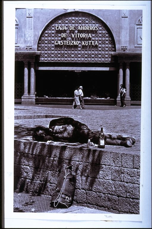 | Resumen: | Certamen "Vitoria insólita" 1989. Segundo premio y placa. Técnica: Fotografía bl. y n. Materia-soporte: Papel Fecha de ejecución: 1989 La fotografía presenta la figura de un mendigo yaciendo en el suelo de la Plaza de los Fueros, en tanto, al fondo se ve la entrada principal de la Caja de Ahorros. |