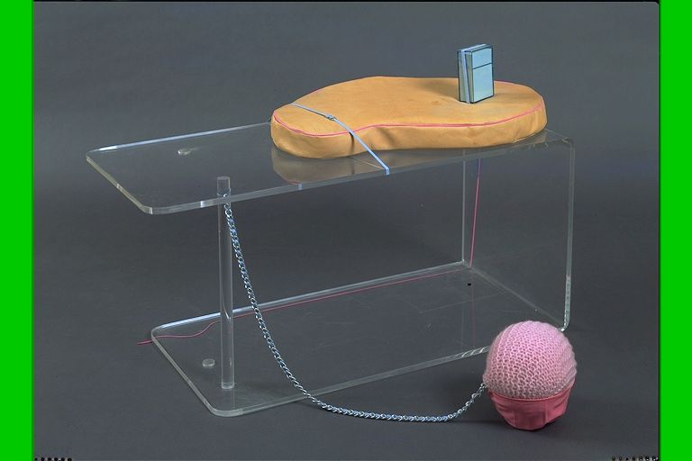 Escultura compuesta por un soporte de metacrilato y varios objetos encima: pelota de lana, cojín, etc.