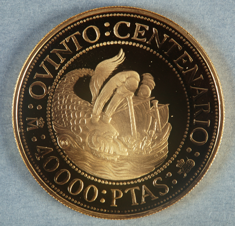 Monedas de oro de la I serie de V Centenario Encuentro de Dos Mundos, año 1992. Mar tenebroso. Valor facial 40.000 pts. Estuche individual de madera.