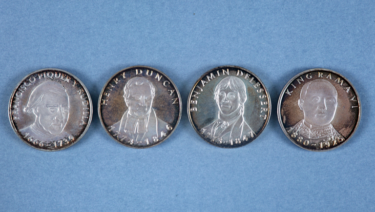 | Resumen: | Técnica: Acuñación Materia-soporte: Plata 900 mls. 2 cajas con 4 medallas. Serie limitada de 2000 ejemplares. En el anverso efigies de: Francesco Piquer y Rudilla, Henri Duncan, Benjamin Delessert y Rama VI. En el reverso, edificios. Serie nº 918 y nº 919. |