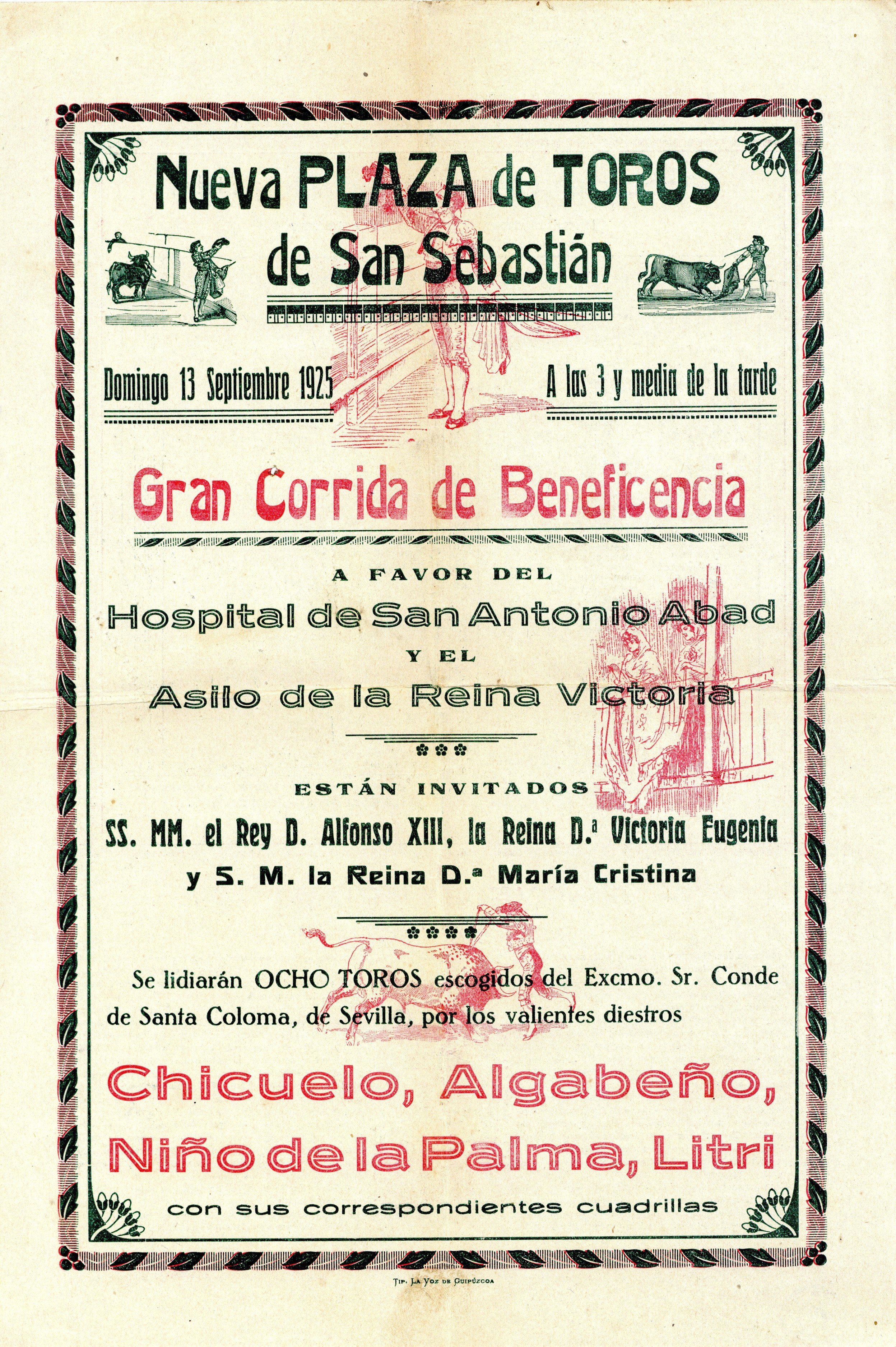 | Título: | Nueva plaza de toros de San Sebastián [Material gráfico] : domingo 13 septiembre 1925 a las 3 y media de la tarde : gran corrida de beneficencia a favor del Hospital de San Antonio Abad y el Asilo de la Reina Victoria : están invitados SS.MM. el rey D. Alfonso XIII, la reina Dª Victoria Eugenia y S.M. la reina Dª María Cristina : se lidarán ocho toros escogidos del Excmo. Sr. Conde de Santa Coloma, de Sevilla, por los valientes diestros Chicuelo, Algabeño, Niño de la Palma, Litri con sus correspondientes cuadrillas. |