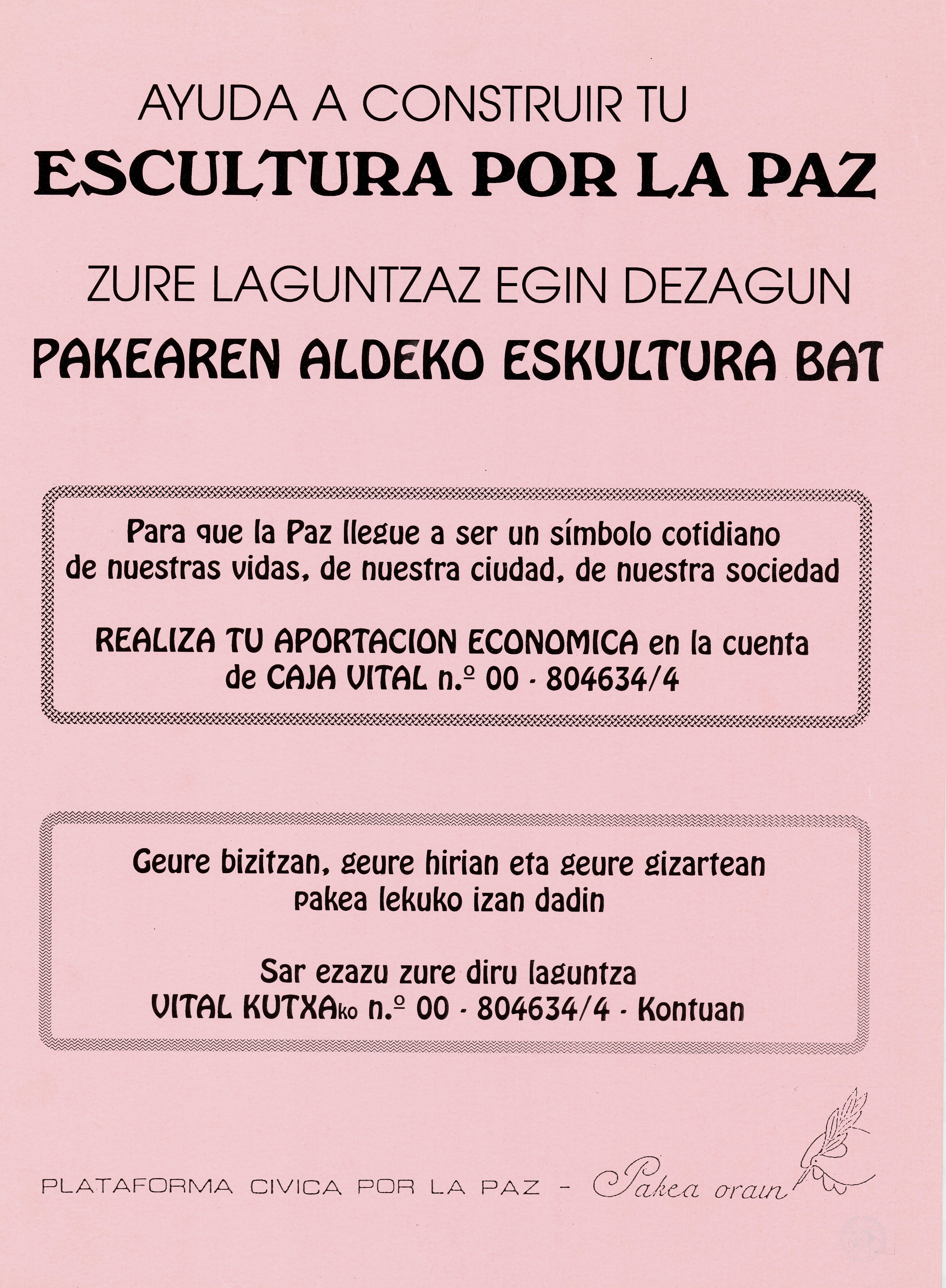 | Otros títulos: | Zure laguntzaz egin dezagun pakearen aldeko eskultura bat : geure bizitzan, geure hirian eta geure gizartean pakea lekuko izan dadin, sar ezazu zure diru laguntza Vital Kutxako... |