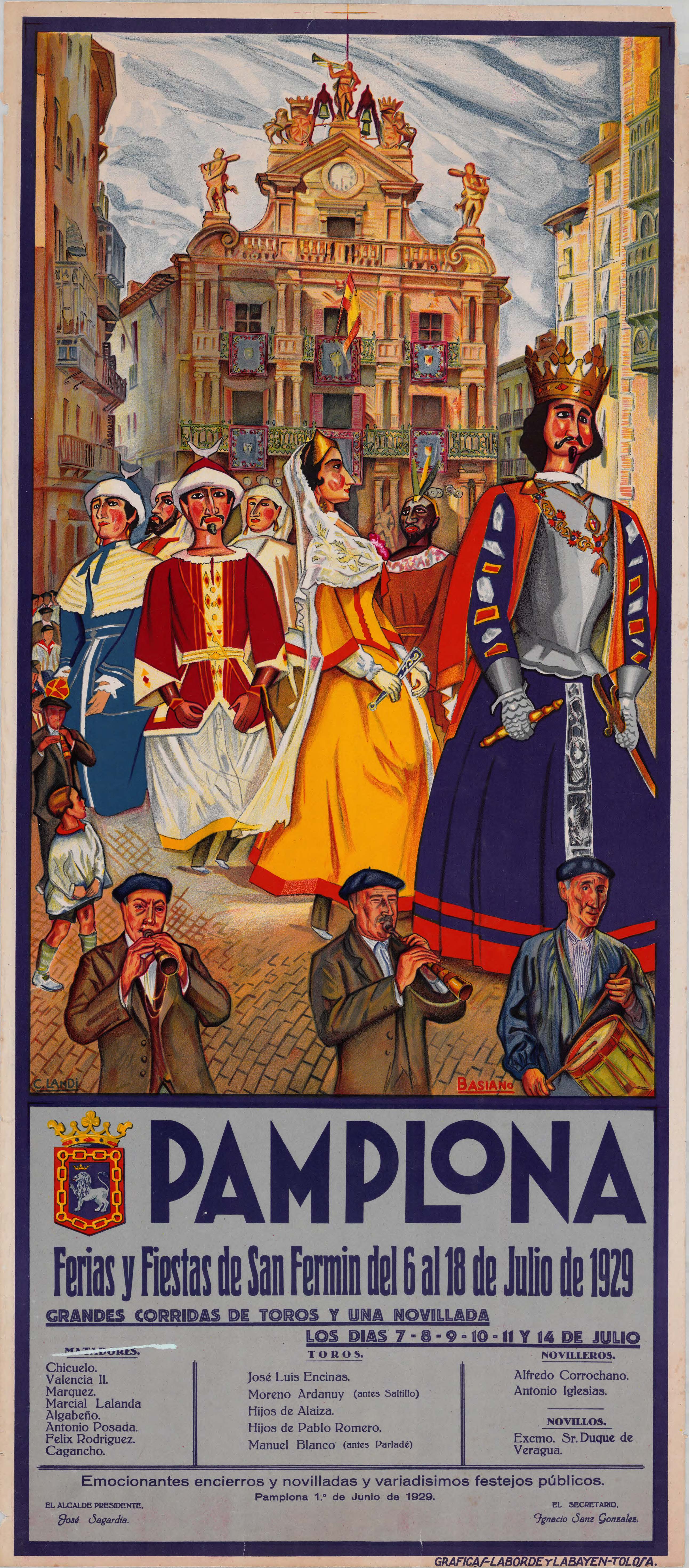 Título: Pamplona [Material gráfico] : ferias y fiestas de San Fermín del 6 al 18 de julio de 1929 : grandes corridas de toros y una novillada los días 7-8-9-10-11 y 14 de julio ... / C. Landi, Basiano.
