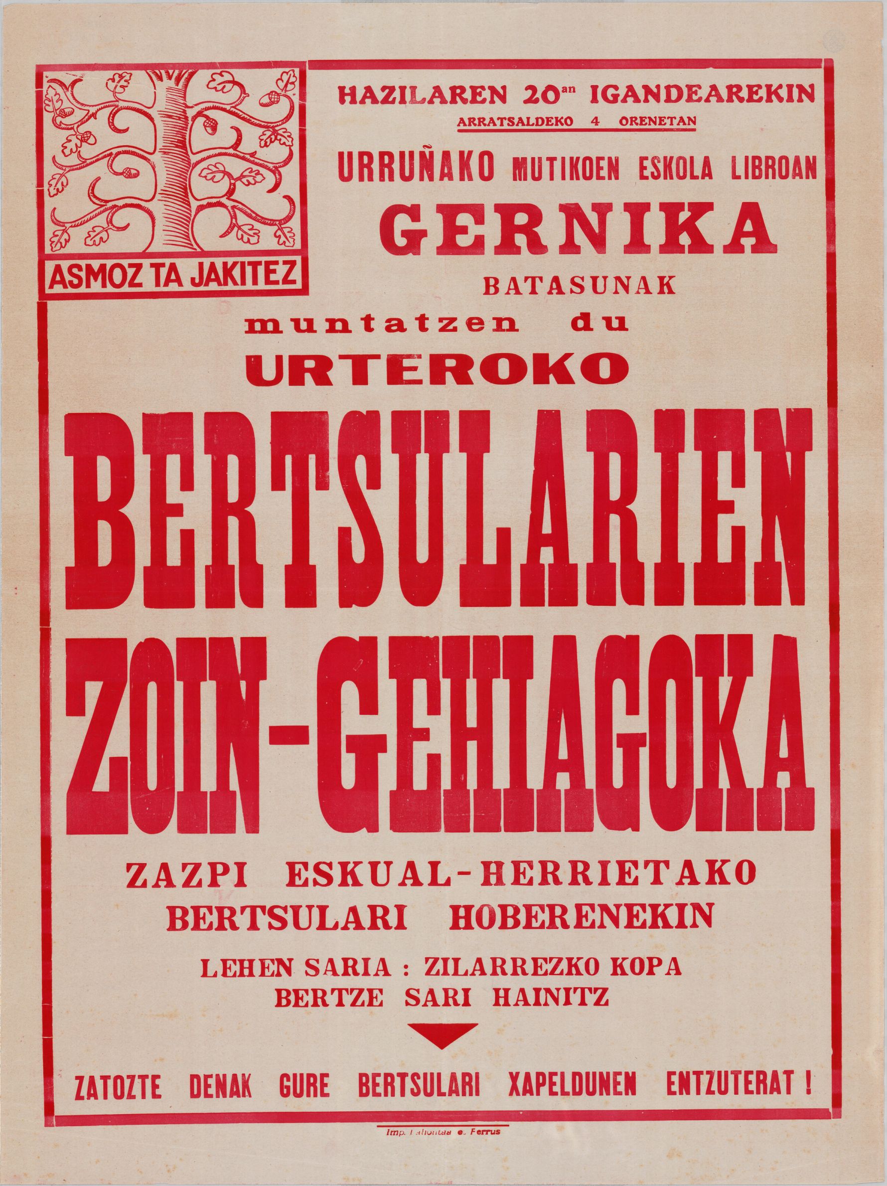 Título: Bertsularien zoin-gehiagoka [Material gráfico] : Urruñako mutikoen eskola libroan Gernika batasunak muntatzen du urteroko : hazilaren 20an igandearekin arratsaldeko 4 orenetan : zazpi eskual-herrietako bertsulari hoberenekin : lehen saria, zilarrezko kopa bertze sari hainitz : zatozte denak gure bertsulari xapeldunen entzuterat!