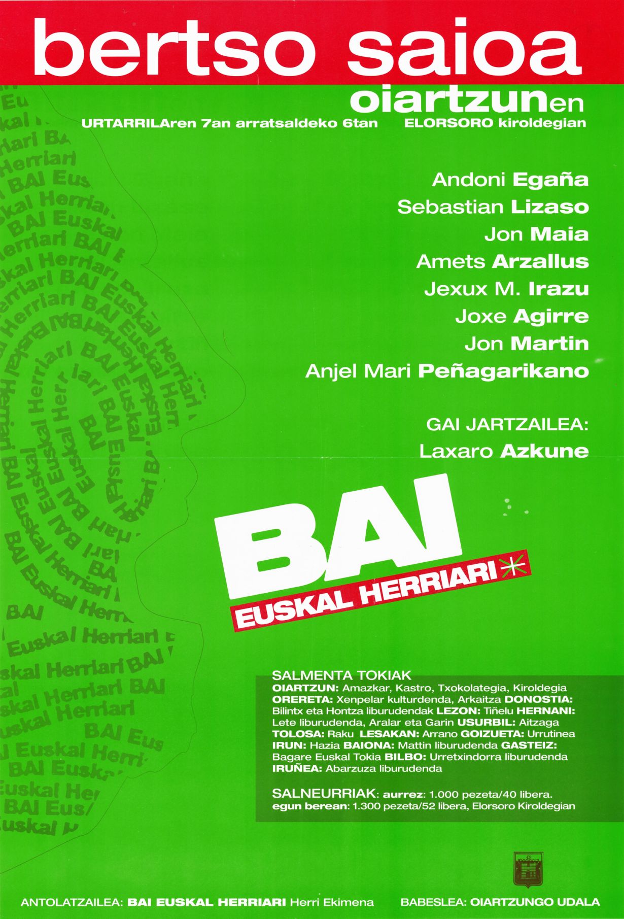 Título: Bertso saioa Oiartzunen [Material gráfico] : urtarrilaren 7an arratsaldeko 6tan Elorsoro kiroldegian : Andoni Egaña,... : Bai Euskal Herriari : salmenta tokiak, Oiartzun... : antolatzilea, Bai Euskal Herriari Ekimena