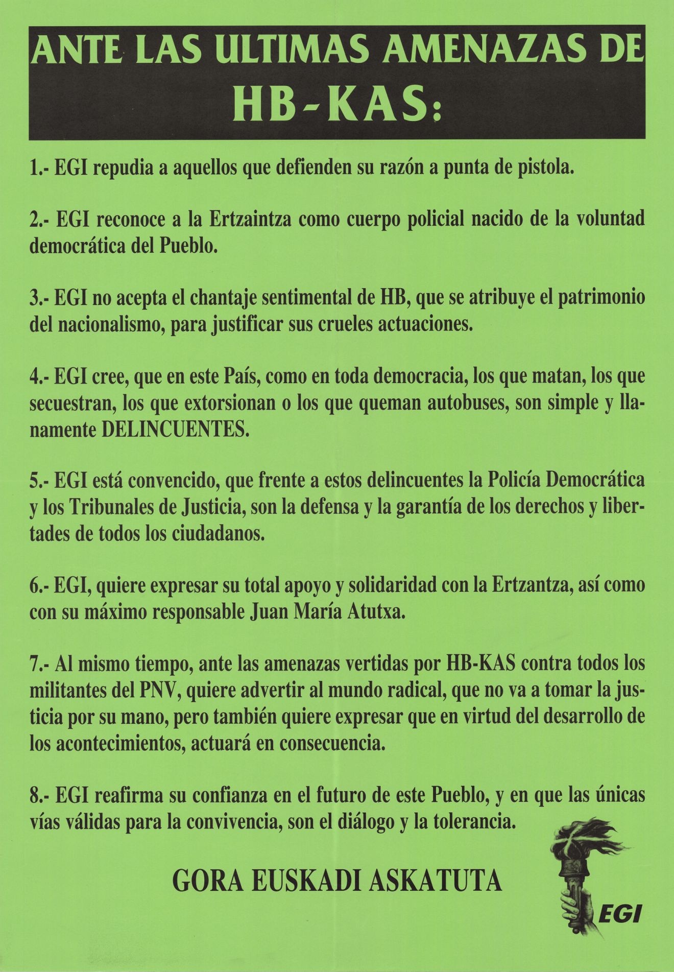 Título: Ante las últimas amenazas de HB-KAS [Material gráfico] : 1. EGI repudia a aquellos que defienden su razón a punta de pistola,... : gora Euskadi askatuta : EGI