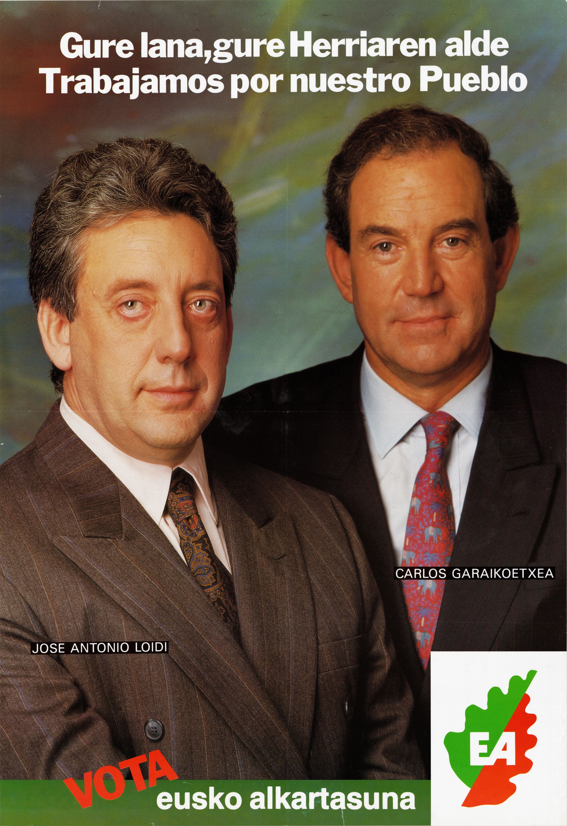 Título: Gure lana, gure herriaren alde [Material gráfico] = Trabajamos por nuestro pueblo : vota Eusko Alkartasuna EA : José Antonio Loidi, Carlos Garaikoetxea