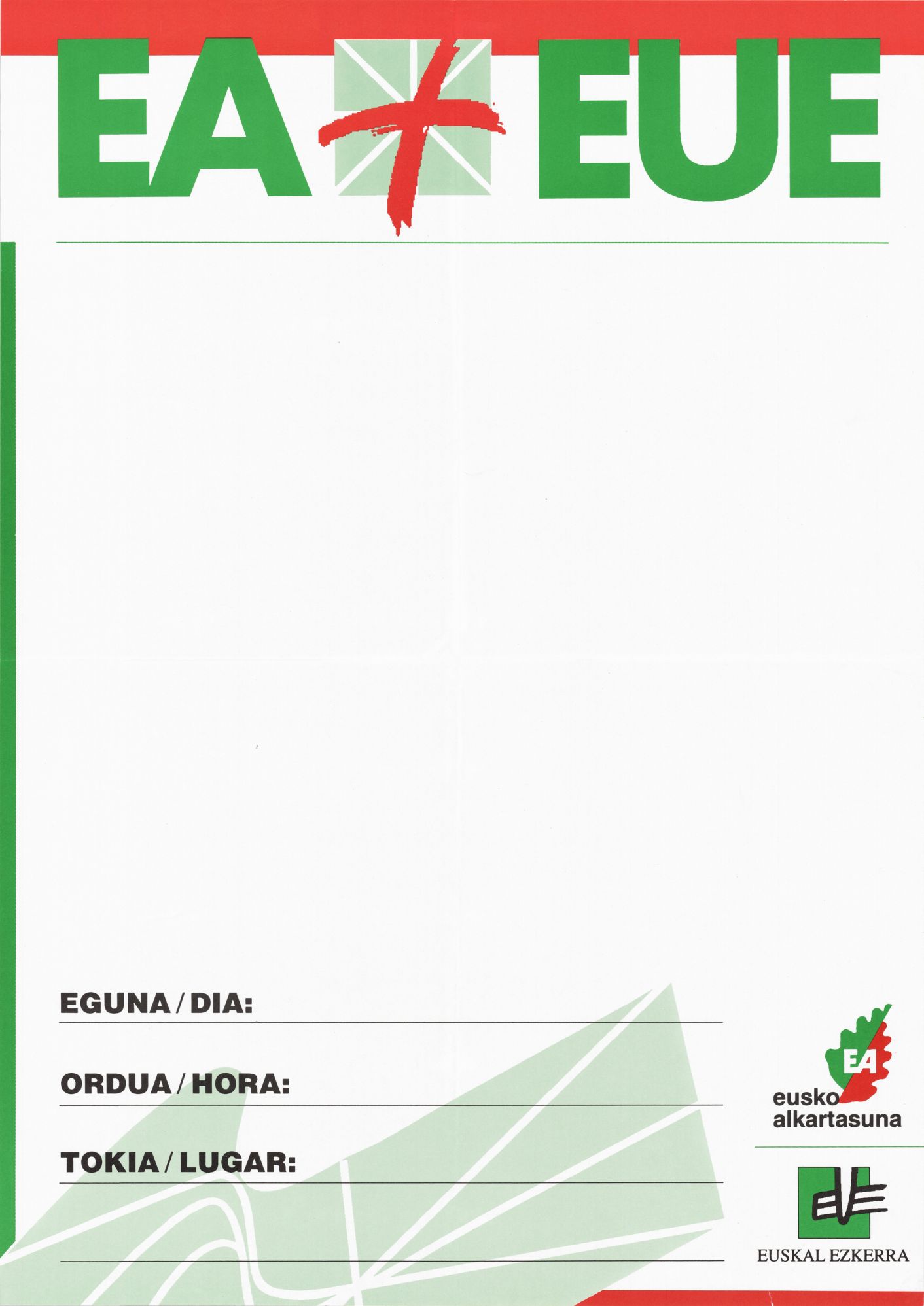 Título: EA + EUE [Material gráfico] : eguna-día, ordua-hora, tokia-lugar : EA Eusko Alkartasuna, Euskal Ezkerra