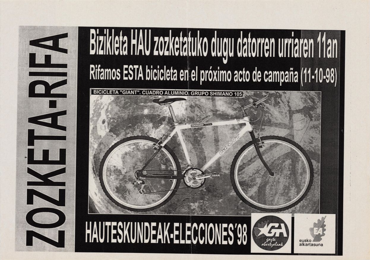 Título: Zozketa-rifa [Material gráfico] : bizikleta hau zozketatuko dugu datorren urriaren 11an : hauteskundeak'98 = rifamos esta bicicleta en el próximo acto de campaña (11-10-98) : elecciones'98 : GA Gazte Abertzaleak, EA Eusko Alkartasuna