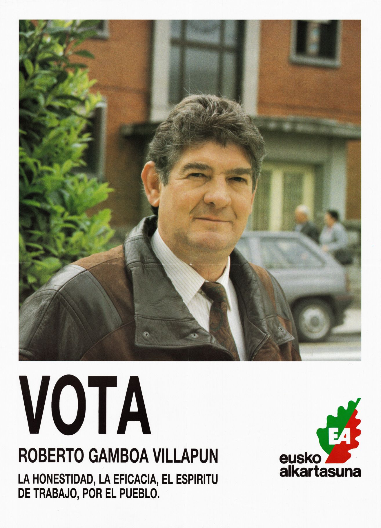 Título: Vota Roberto Gamboa Villapun [Material gráfico] : la honestidad, la eficacia, el espíritu de trabajo, por el pueblo : EA Eusko Alkartasuna