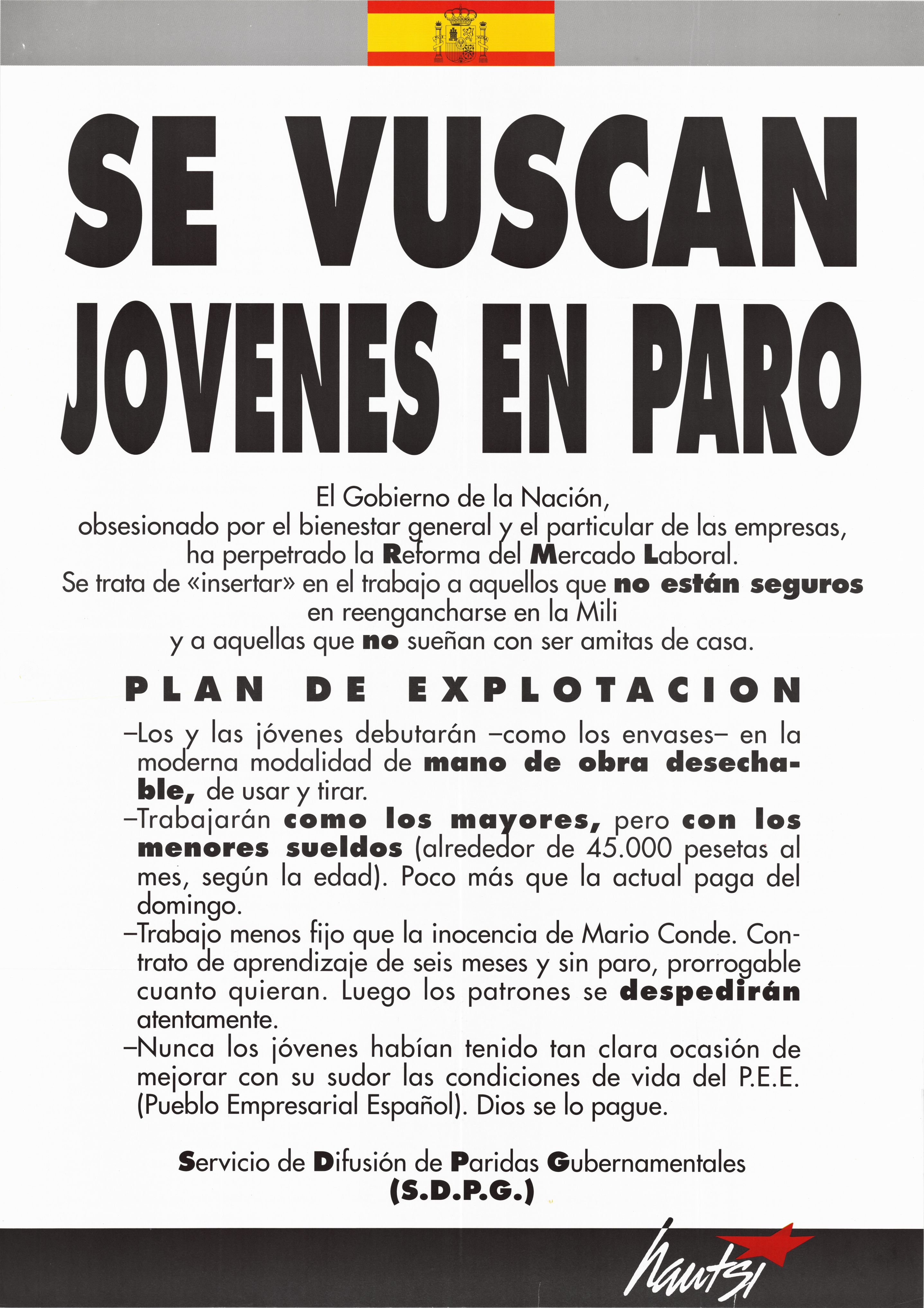 Título: Se vuscan [sic] jóvenes en paro [Material gráfico] : el gobierno de la nación, obsesionado por el bienestar general... : Servicio de Difusión de Paridas Gubernamentales (S.D.P.G.) :