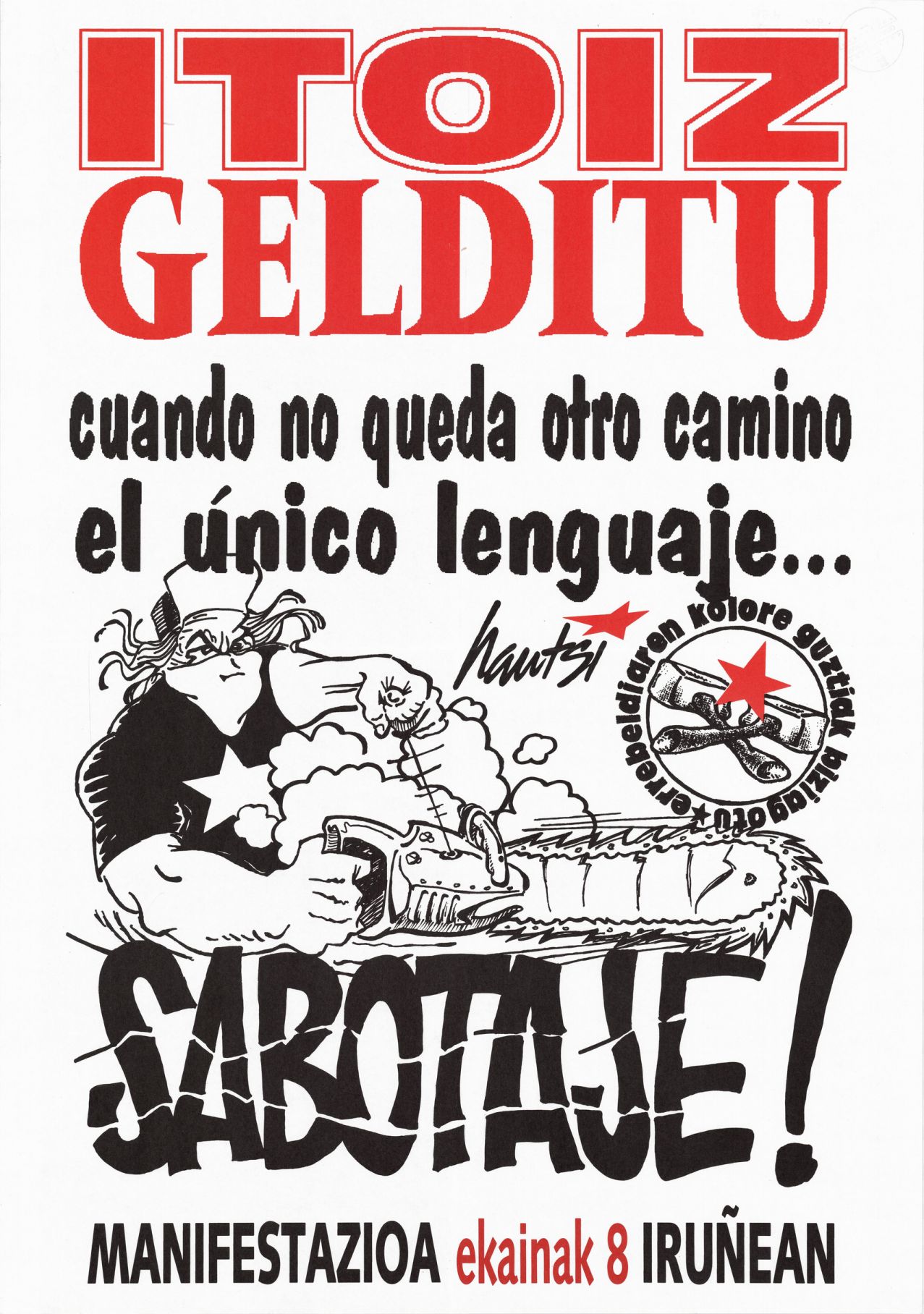 Título: Itoiz gelditu [Material gráfico] : cuando no queda otro camino el único lenguaje__ sabotaje! : manifestazioa ekainak 8 iruñean : HAUTSI errebeldiaren kolore guztiak biziagotu