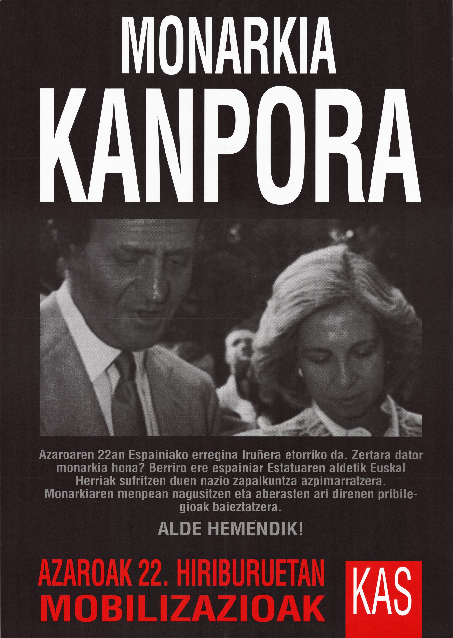 Título: Monarkia kanpora [Material gráfico] : azaroaren 22an Espainiako erregina Iruñera etorriko da, zertara dator... : alde hemendik! : azaroak 22. hiriburuetan mobilizacioak : KAS