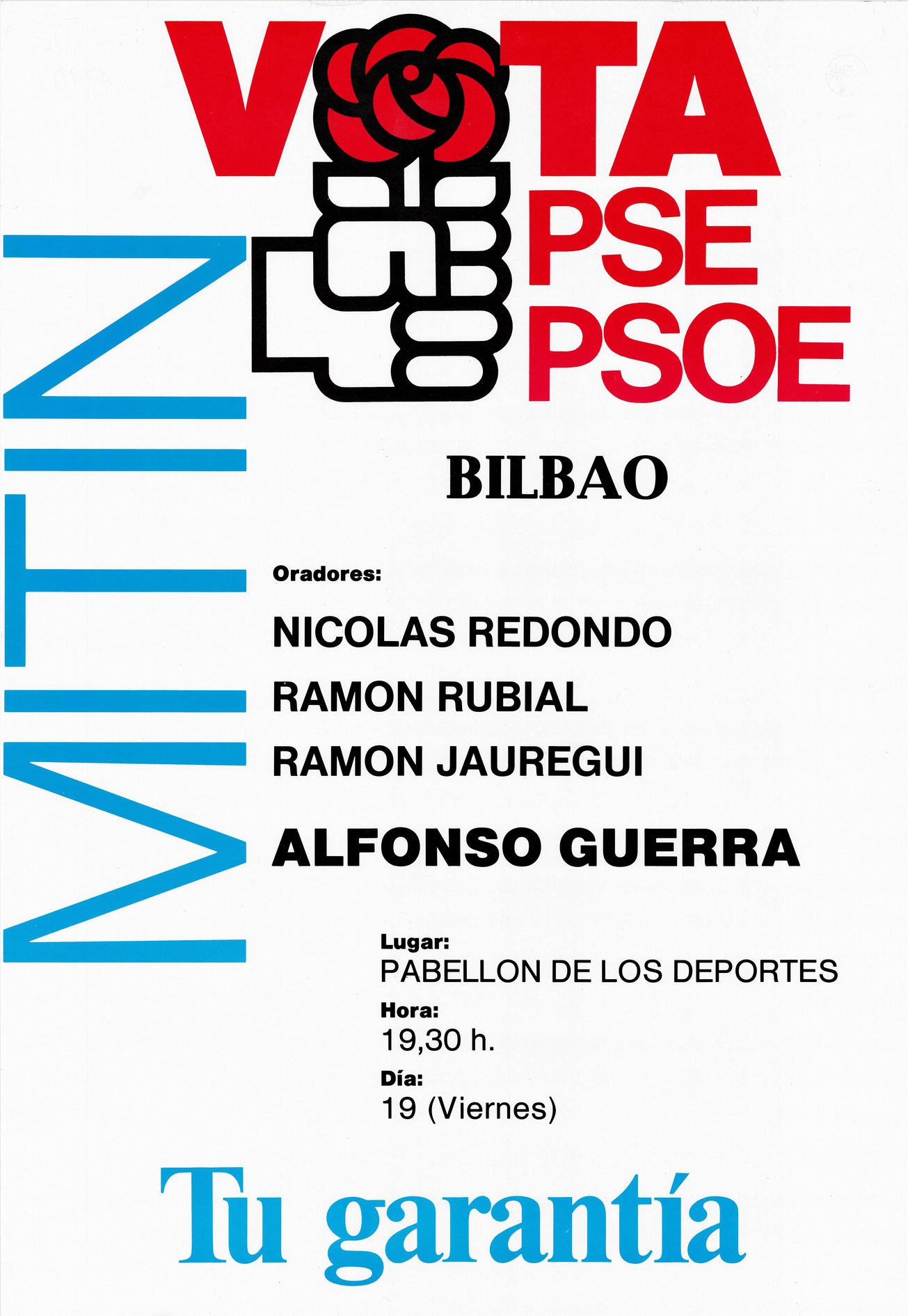 | Título: | Vota PSE PSOE [Material gráfico] : mitin Bilbao, oradores, Nicolás Redondo, Ramón Rubial, Ramón Jáuregui, Alfonso Guerra, lugar, Pabellón de los Deportes, hora, 19,30 h., día, 19 (viernes) : tu garantía |