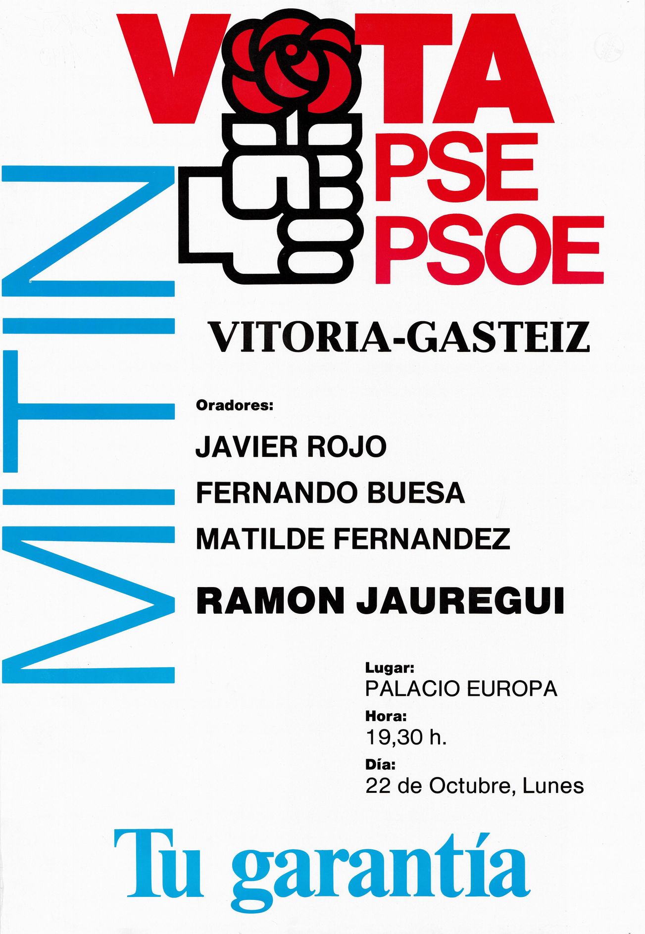 | Título: | Vota PSE PSOE [Material gráfico] : mitin Vitoria-Gasteiz, oradores, Javier Rojo, Fernando Buesa, Matilde Fernández, Ramón Jáuregui, lugar, Palacio Europa, hora, 19,30 h., día, 22 de octubre, lunes : tu garantía |