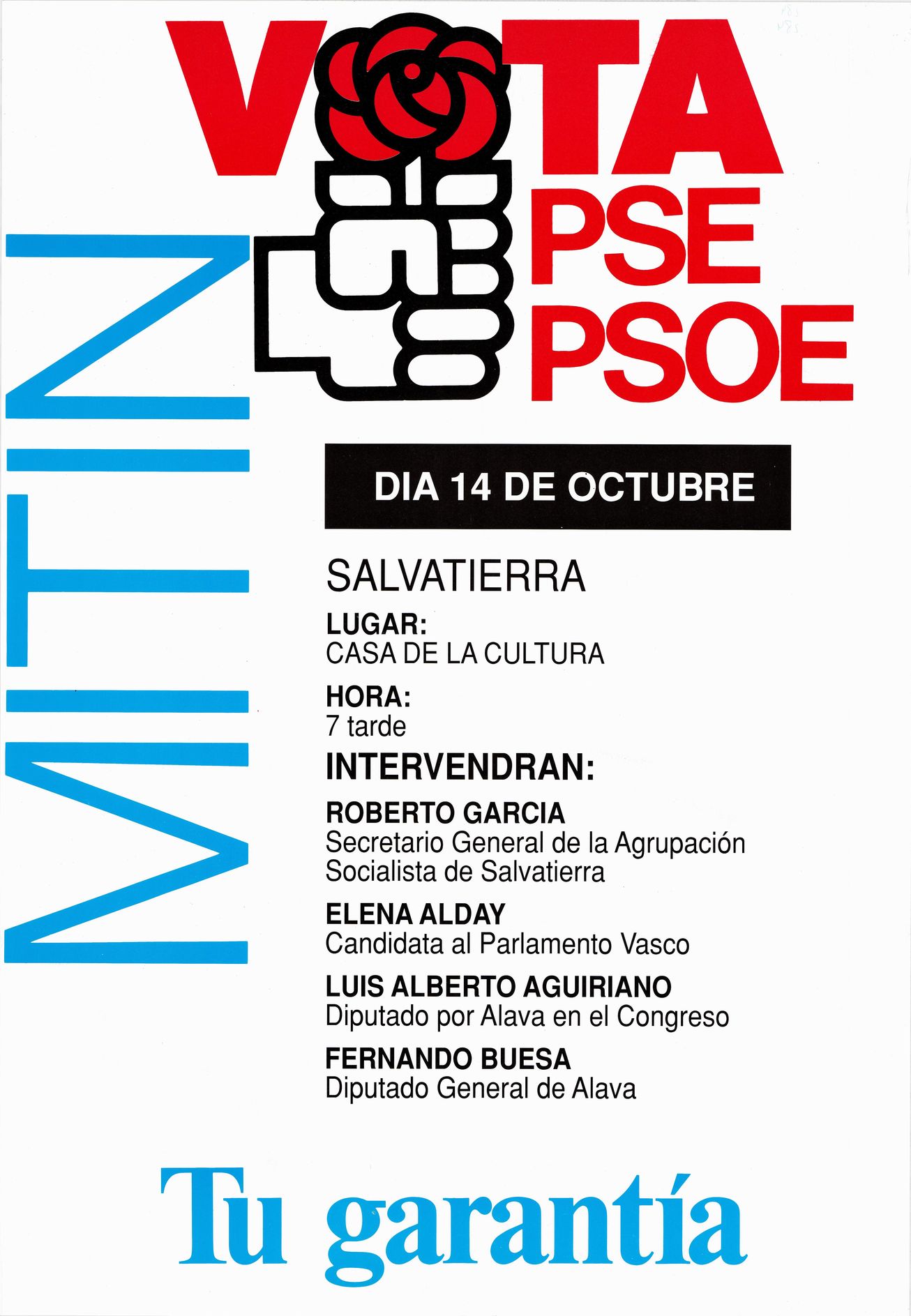 Título: Vota PSE PSOE [Material gráfico] : mitin día 14 de octubre, Salvatierra lugar, Casa de la Cultura, hora, 7 tarde, intervendrán, Roberto García,... Fernando Buesa diputado general de Álava : tu garantía